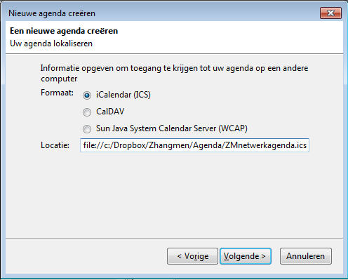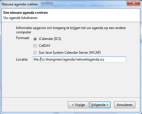 d) Let er op dat u voor het netwerkpad de precies het juiste format gebruikt nl. de letters 'file://' voor het pad en erna de extensie .ics , dus bv. file://z:/zhangmen/agenda/netwerkagenda.ics (file://z:\zhangmen\agenda\netwerkagenda.ics werkt ook).