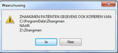 d) Zhangmen vraag of er lokale gegevens van de lokale PC naar het netwerk mogen worden geschreven. NB: doe dit alleen een eerste keer. Als u hierna meerdere Zhangmen PC's ook naar deze netwerkschijf laat verwijzen moet u dit NIET opnieuw doen bij andere PC's, omdat daarmee de bestaande gegevens in de Zhangmen netwerk worden overschreven.
