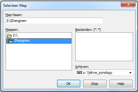 b) Kies de gedeelde netwerkmap (share of shared folder) of schijf waarin u de Zhangmen database wilt gaan gebruiken. We kiezen in het voorbeeld voor een netwerkschijf en folder Z:\zhangmen maar het kan ook bv. een gedeelde DropBox folder zijn als c:\Users\xxxx\Documents\My Dropbox\