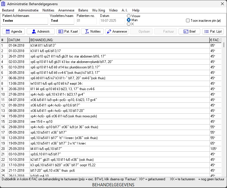 | Facturatie | Zhangmen heeft de mogelijkheid om te factureren (via MS-Excel.) en deze facturen via email (MS-Outlook) te emailen. Hoewel Zhangmen primair een acupunctuur inhoudelijk pakket is kunt u uw praktijkvoering er volledig mee doen. Facturatie van behandelingen met Zhangmen voldoet aan door de zorgverzekeraars en overheid gestelde standaarden en bevat indien gewenst o.a. BTW-, verzekerings/mutualiteiten- en KvK- gegevens. |